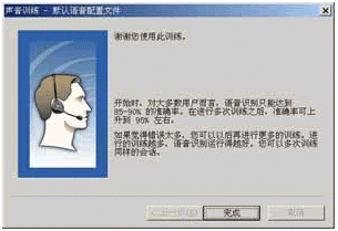 當(dāng)你15分鐘的訓(xùn)練全部結(jié)束后,將會(huì)看到如圖12所示的對(duì)話框,此時(shí)原來默認(rèn)的用戶配置文件將用剛才所收集的訓(xùn)練數(shù)據(jù)進(jìn)行更新,稍候片刻,你就會(huì)看到如圖13所示的對(duì)話框,告訴你語音訓(xùn)練已經(jīng)結(jié)束。
