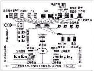 該方案采用Cisco的ICM中間件軟件作為系統(tǒng)的CTI服務器軟件平臺,并采用相關廠商的IVR和Dialer產(chǎn)品作為IVR服務器和外撥服務器軟件。地市客服中心采用了交換機的遠端模塊設置遠端座席。Cisco的ICM中間件不但具有大話務量處理的高性能,而且支持多點呼叫中心的設置和基于純IP技術的呼叫中心的擴充,從而保證了系統(tǒng)的可擴展性。系統(tǒng)結(jié)構(gòu)如圖1所示。