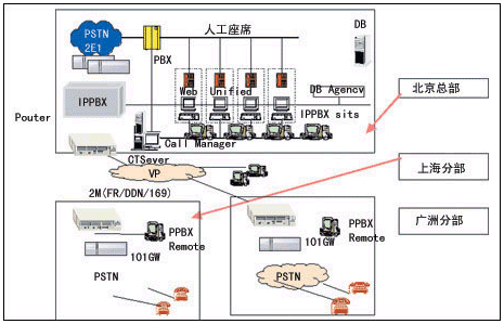 分布式呼叫中心一般由總中心和分中心組成,它們之間可以是對(duì)等關(guān)系或隸屬關(guān)系,各中心分布于不同的地理位置,在運(yùn)作時(shí)間、資源、功能上互相協(xié)作,為用戶提供最大限度的服務(wù)。分布式呼叫中心在功能上的突出需求為:用戶打入的電話可以在各分呼叫中心之間轉(zhuǎn)接,即實(shí)現(xiàn)網(wǎng)絡(luò)ACD;不論用戶資料存放于何地理位置的數(shù)據(jù)庫(kù),它都應(yīng)能在電話被派到話務(wù)員座席時(shí),在來(lái)電信息中彈出,即實(shí)現(xiàn)遠(yuǎn)程數(shù)據(jù)訪問(wèn);具有響應(yīng)IP電話的能力,以處理通過(guò)IP網(wǎng)絡(luò)傳送過(guò)來(lái)的異地用戶呼叫或Web呼叫;呼叫排隊(duì)模塊應(yīng)具有較強(qiáng)的路由能力,以使異地用戶能直接被最適合的話務(wù)員接聽。