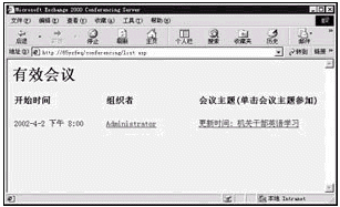 如果在前面已設置了提醒功能,那么在臨近會議前屏幕上將出現提醒窗口。教師機和學生機有三種方法可以參加會議:點擊提醒窗口中[參加會議]按鈕;或者不等提醒,直接點擊會議邀請函中的鏈接打開會議網頁;最好的方式還是打開IE,輸入網址http://x/conferencing/list.asp進入會議(x為Exchange服務器的IP地址或計算機名),如圖3。