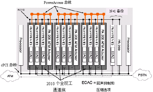 為了解決CompactPCI的這一限制,NMS開發(fā)出了PowerAccess體系結(jié)構(gòu),它借助現(xiàn)有的CompactPCI標(biāo)準(zhǔn),同時(shí)把它的通道容量擴(kuò)展到2048之上。這種體系結(jié)構(gòu)以PowerAccess總線為特色,PowerAccess總線是一個(gè)輔助的4096個(gè)TDM時(shí)隙,支持現(xiàn)存的CompactPCI H.110總線。由于提供語音通道的增多,從而可以提高系統(tǒng)的密度。