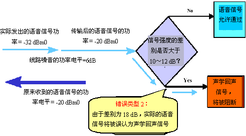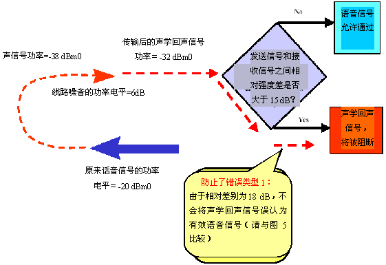 然而,如果判斷過程是根據(jù)功率電平的相對差異來進(jìn)行的(而不是絕對差異),測量結(jié)果將更為準(zhǔn)確。通過在靜音期間測量兩個傳輸方向上的線路功率電平,就能得知相對的功率電平差異。使用在靜音期間獲得的信息,在分類信號前(即決定信號是聲學(xué)回聲還是有效語音),對呼叫兩端的功率電平差異進(jìn)行修正,就能更加準(zhǔn)確地了解相對信號強度。該方法稱為智能語音檢測,它能顯著降?quot;錯誤類型1"出現(xiàn)的可能性,如圖9所示。注意,在分析該方法時,請比對圖5和圖9。