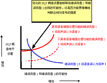 dB)能夠顯著降低將雙對話語音信號誤認(rèn)為聲學(xué)回聲信號的概率,從而防止了"錯誤類型2"?傊,在"錯誤類型1"(實線曲線,具有語音增強特性)和"錯誤類型2"曲線的交叉點上,通過與之對應(yīng)的NLP設(shè)置,可以獲得最佳的性能(請參見圖10)。