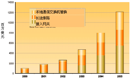 隨著因特網(wǎng)業(yè)務(wù)的普及,與傳統(tǒng)電信業(yè)務(wù)供應(yīng)商形成競(jìng)爭(zhēng)、替代局面的新業(yè)務(wù)供應(yīng)商看到了重大的機(jī)會(huì):利用通過包網(wǎng)絡(luò)傳送話音(VoP)業(yè)務(wù)取代分離的話音/數(shù)據(jù)網(wǎng)業(yè)務(wù)。VoP技術(shù)最初主要用于長(zhǎng)途旁路。在過去的兩年里,VoP網(wǎng)絡(luò)的發(fā)展勢(shì)頭明顯加快,通過寬帶網(wǎng)傳送話音的接入網(wǎng)關(guān)正在推廣,利用VoP本地網(wǎng)關(guān)代替?zhèn)鹘y(tǒng)中心局交換機(jī)的機(jī)會(huì)也已出現(xiàn)。圖1用圖例說明了VoP在交換機(jī)替換、長(zhǎng)途旁路和接入網(wǎng)關(guān)方面市場(chǎng)的分塊大小以及對(duì)末來的預(yù)測(cè)。