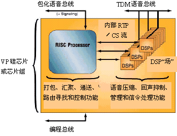 這種新型半導(dǎo)體元件被叫作語音處理器(VP),它不是技術(shù)創(chuàng)新成果,而只是傳統(tǒng)DSP核心和通用RISC處理器在一個(gè)或兩個(gè)硅片上的重新包裝和集成。DSP核心完成VoP的壓縮、回聲抑制和各種信號(hào)處理任務(wù),而RISC處理器完成VoP的匯聚和打包處理。