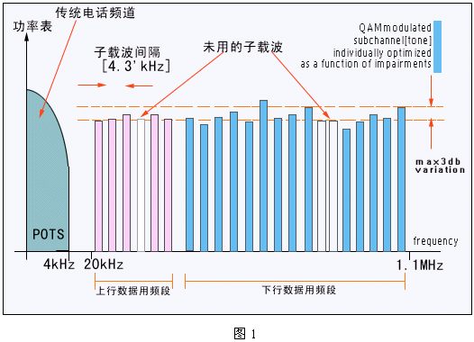DSL技術(shù)是在人們對高速互聯(lián)網(wǎng)訪問需求推動下的產(chǎn)物。DSL利用頻率復用和OFDM調(diào)制技術(shù),在不影響傳統(tǒng)電話業(yè)務的前提下可以為用戶提供最高達8Mbps的數(shù)據(jù)傳輸速率。這個速率是基于POTS的Modem速率(以目前的最高速率56kbps為參考)的140倍;DSL技術(shù)所帶來的巨大帶寬為家庭和小型公司提供了一個寬帶數(shù)字業(yè)務的新平臺。這個DSL平臺可以支持多種寬帶業(yè)務:包括高速Internet接入、虛擬專網(wǎng)及VOD等流媒體業(yè)務。其基本原理如下圖1所示: