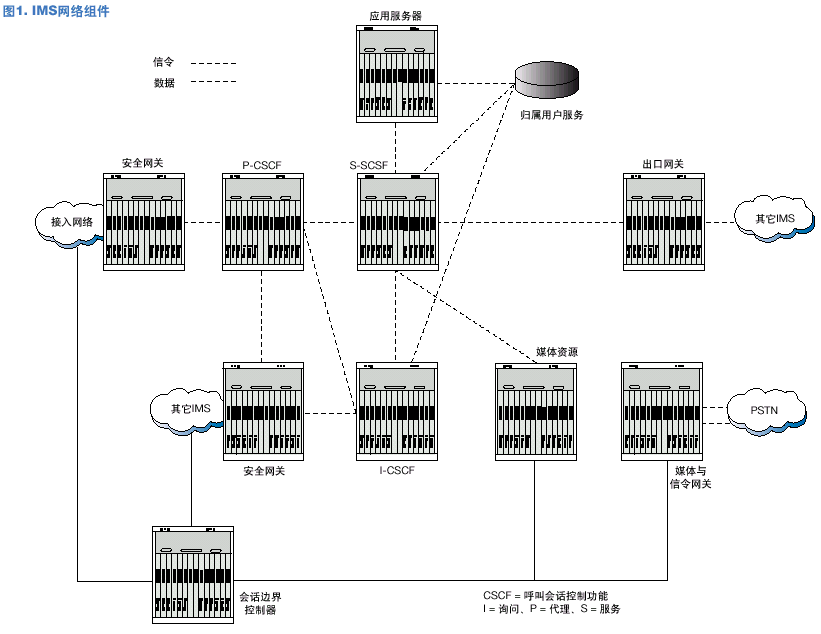 為獲得上述優(yōu)勢(shì),IMS主要使用了如下組件:歸屬用戶(hù)服務(wù)、呼叫會(huì)話(huà)控制功能、安全網(wǎng)關(guān)、IP媒體服務(wù)器、及應(yīng)用服務(wù)器。圖1是這些組件及其它IMS網(wǎng)絡(luò)組件的圖解。