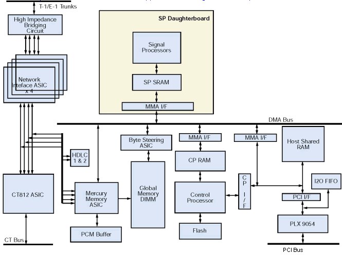 (T-1和E-1裝配有所不同) 兩塊子板上面各有一組DSP. 當(dāng)開電時(shí)電話信令協(xié)議和語(yǔ)音處理功能被下載到板卡上. 在處理器上作為固件存在,