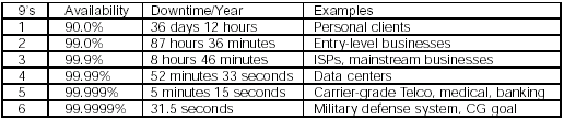 正如表中建議的那樣,實(shí)用性尤其在非常接近1的區(qū)間內(nèi)才被討論。盡管99%的正常運(yùn)行時(shí)間看起來(lái)很好,它仍然將導(dǎo)致每年超過(guò)3天半的故障時(shí)間。大部分方案不會(huì)被認(rèn)為是高可用的,直到它們接近99.9%的運(yùn)行時(shí)間--大概每年9個(gè)小時(shí)的故障時(shí)間。但是,通信行業(yè)使用4個(gè)9級(jí)別到5個(gè)9級(jí)別范圍的實(shí)用性。