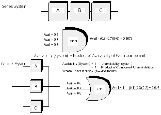 由于冗余被引入系統(tǒng),系統(tǒng)的可用特性發(fā)生了重大的改變。實(shí)用性計(jì)算變成了一種費(fèi)力并且容易出錯(cuò)的工作,因?yàn)橛?jì)算必須考慮冗余的效果,失效切換到冗余組件的成功率,MTTR失效組件的效率及相似的問(wèn)題。使用平臺(tái)和電話板塊MTTF數(shù)據(jù)作為輸入和使用可靠模塊圖(RBD)2以正確決定系統(tǒng)級(jí)別可用特性可以獲得更好的結(jié)果。
