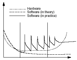通常,硬件遵循所謂"浴缸曲線"--故障率在系統(tǒng)投入使用的前幾個(gè)月降低,但是在一定時(shí)間后再一次增加。最初的降低是因?yàn)?quot;強(qiáng)化試驗(yàn)",較差的組件失效的相對(duì)較快,而被去除掉。較穩(wěn)定的組件在系統(tǒng)中保留下來(lái)。一段時(shí)間后,它們開始變差,最終失效。硬件行為在下面的圖中由點(diǎn)線表示。