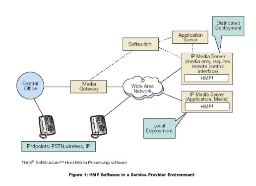 圖1表示使用HMP軟件的IP媒體服務(wù)器,部署在典型的服務(wù)提供商環(huán)境的例子,包括IVR,通告,語(yǔ)音郵箱/消息,語(yǔ)音識(shí)別和會(huì)議服務(wù)器。