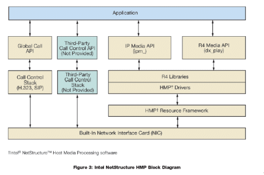 HMP軟件結(jié)構(gòu)與Dialogic Dialogic 板卡DM3結(jié)構(gòu)同樣的方式, 但不需要專(zhuān)門(mén)的硬件。