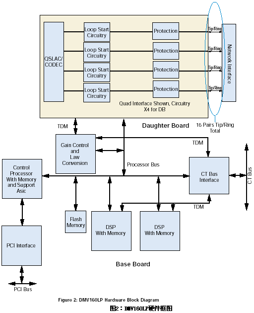 當板卡上的呼叫處理資源被利用的時候,網(wǎng)絡(luò)信號就被提取出來并且被送到板卡上的控制處理器中,該處理器可以改變信道狀態(tài)而且可以通過共享的RAM和主機的PCI總線將信道事件傳送給應(yīng)用程序接口。