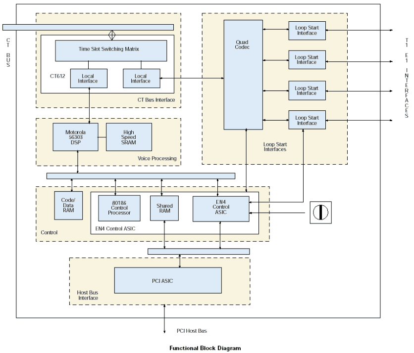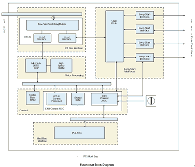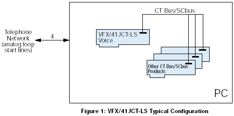 使用VFX/41JCT-LS板卡和CT總線時(shí),來(lái)自網(wǎng)絡(luò)板卡或其他資源的數(shù)字語(yǔ)音和資源通過(guò)H.100接頭和CT總線接口進(jìn)入板卡。由一個(gè)CT612芯片管理這些信號(hào),并且作為通道協(xié)調(diào)器和矩陣交換機(jī)來(lái)緩存來(lái)自總線的高速信號(hào)數(shù)據(jù),直到每個(gè)通道的數(shù)據(jù)發(fā)送到DSP。