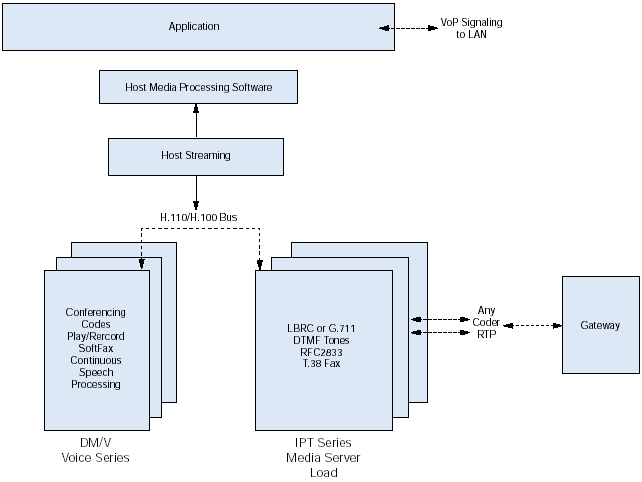 如圖2所示,IPT系列板卡可以通過H.110總線連接到任何一個(gè)高密度的Dialogic Dialogic DM/V語(yǔ)音系列媒體處理板卡上。開發(fā)商通過組合IPT系列和DM/V板卡,便可以分發(fā)他們的解決方案,包括語(yǔ)音處理、傳真、講話以及會(huì)議功能,這套解決方案可以使每個(gè)系統(tǒng)可以從數(shù)以百計(jì)的端口升級(jí)到數(shù)以千計(jì)的端口。開發(fā)商也可以選擇使用IPT系列板卡作為高密度接口板卡,并連接到PCI總線使其可以訪問在主機(jī)處理器上執(zhí)行的媒體處理功能。