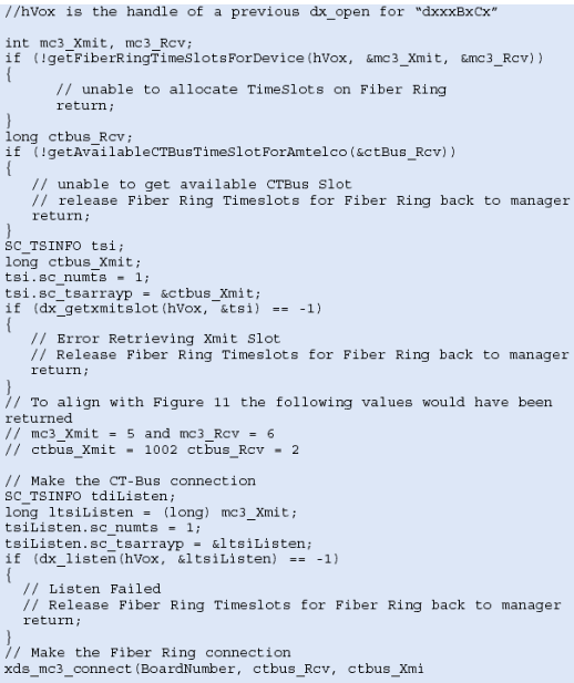 圖12是服務(wù)器1上建立連接所需的代碼示例,注意:xds_mc3_listen 和 xds_h100_listen函數(shù)不能以相同的方式看到連接,使用這些函數(shù)以前請(qǐng)參考API手冊(cè)確信這些函數(shù)的功能。