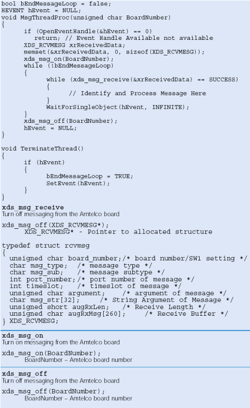 缺省情況下Amtelco卡不向應(yīng)用發(fā)送消息,應(yīng)用必須調(diào)用sdx_msg_on函數(shù)請(qǐng)求消息發(fā)送。當(dāng)用應(yīng)用停止后,需要sdx_msg_off函數(shù)停止發(fā)送消息。(注意:如果運(yùn)行多個(gè)應(yīng)用監(jiān)控板上消息,確信必須是最后一個(gè)應(yīng)用調(diào)用sdx_msg_off函數(shù))