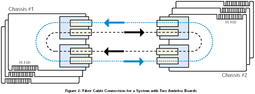 該配置由兩個(gè)服務(wù)器組成,其中一個(gè)配置成主機(jī),另外一個(gè)配置成客戶機(jī)。主機(jī)通過光纖環(huán)路為整個(gè)系統(tǒng)提供時(shí)鐘,客戶機(jī)則通過光纖環(huán)路得到時(shí)鐘。對(duì)于主機(jī)服務(wù)器,Amtelco卡需要在Dialogic®