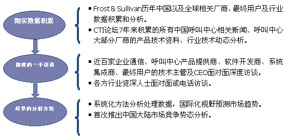 Frost & Sullivan 和 CTI論壇(www.mysaio.com)共同組成的調(diào)研小組,在查閱了大量資料的基礎之上,以企業(yè)通信及呼叫中心的設備應用、投資計劃以及相關廠商的市場表現(xiàn)為出發(fā)點,通過對企業(yè)通信及呼叫中心重要應用企業(yè)、在市場占主導地位的二十多家設備廠商、二十多家軟件開發(fā)商、十幾家系統(tǒng)集成商、數(shù)家外包運營商的深度訪談,參閱內(nèi)部相關報告及數(shù)據(jù)庫,對數(shù)據(jù)的來源和數(shù)據(jù)的準確性進行了詳細核對與論證;憑借參與調(diào)研人員的多年從業(yè)經(jīng)